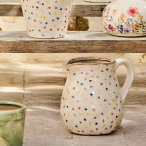Der Bea Krug besteht aus Steingut mit Craquelé-Glasur. Es wurde handgefertigt, und das Blumenmuster auf jedem Artikel ist einzigartig.