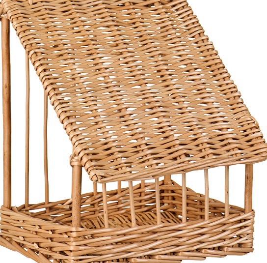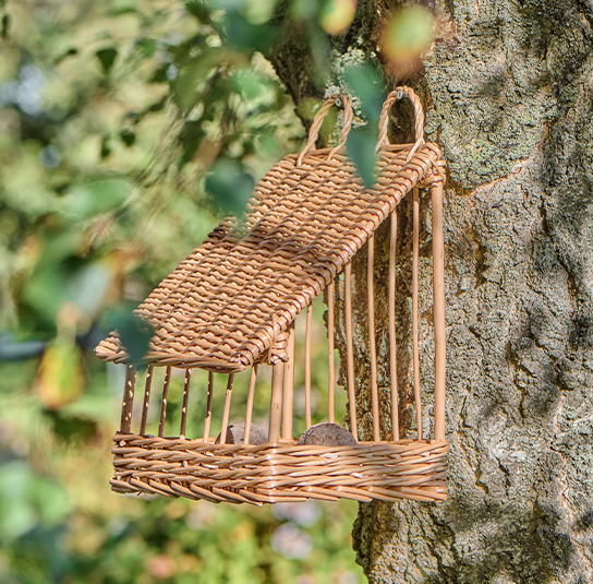 Handgefertigtes Vogelfutterhaus aus Weide zur Befestigung an Wand oder Baum. Das schräge Dach schützt das Futter vor Regen und bietet den Vögeln einen geschützten und sicheren Platz zum Fressen. Ein schönes Detail, das Leben in den Garten bringt.